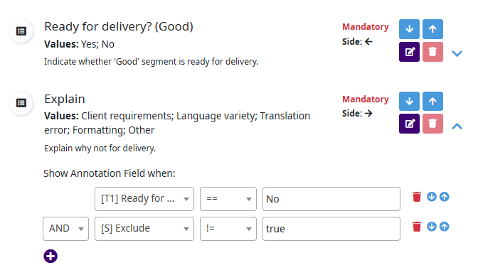 Each field in an annotation set can be configured with dynamic visibility conditions: when the conditions are fulfilled the field is displayed on the evaluation form, otherwise the field stays hidden.