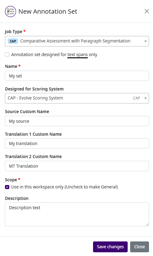 Enables or disables span annotation mode. When enabled, evaluators can select substrings (spans) within the source, translation 1, or translation 2 text and annotate them individually. This is a special type of annotation applied to selected text ranges rather than to the entire segment. |